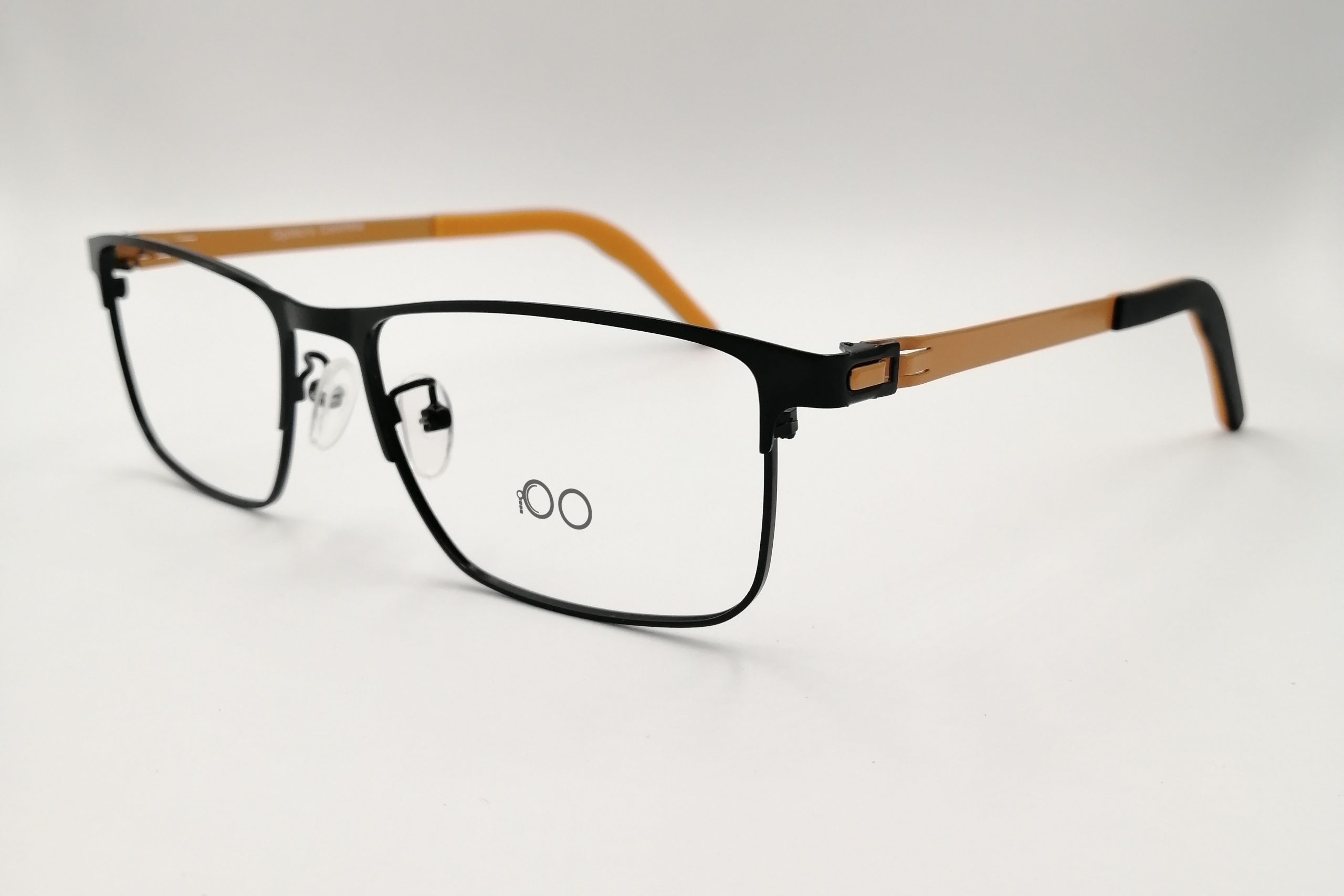 Montura estilo cuadrada, fabricada en material metal, color negro naranja, con un marco al aire talla L, con un peso aproximado de 15 g, incluye cofre para guardarlas.