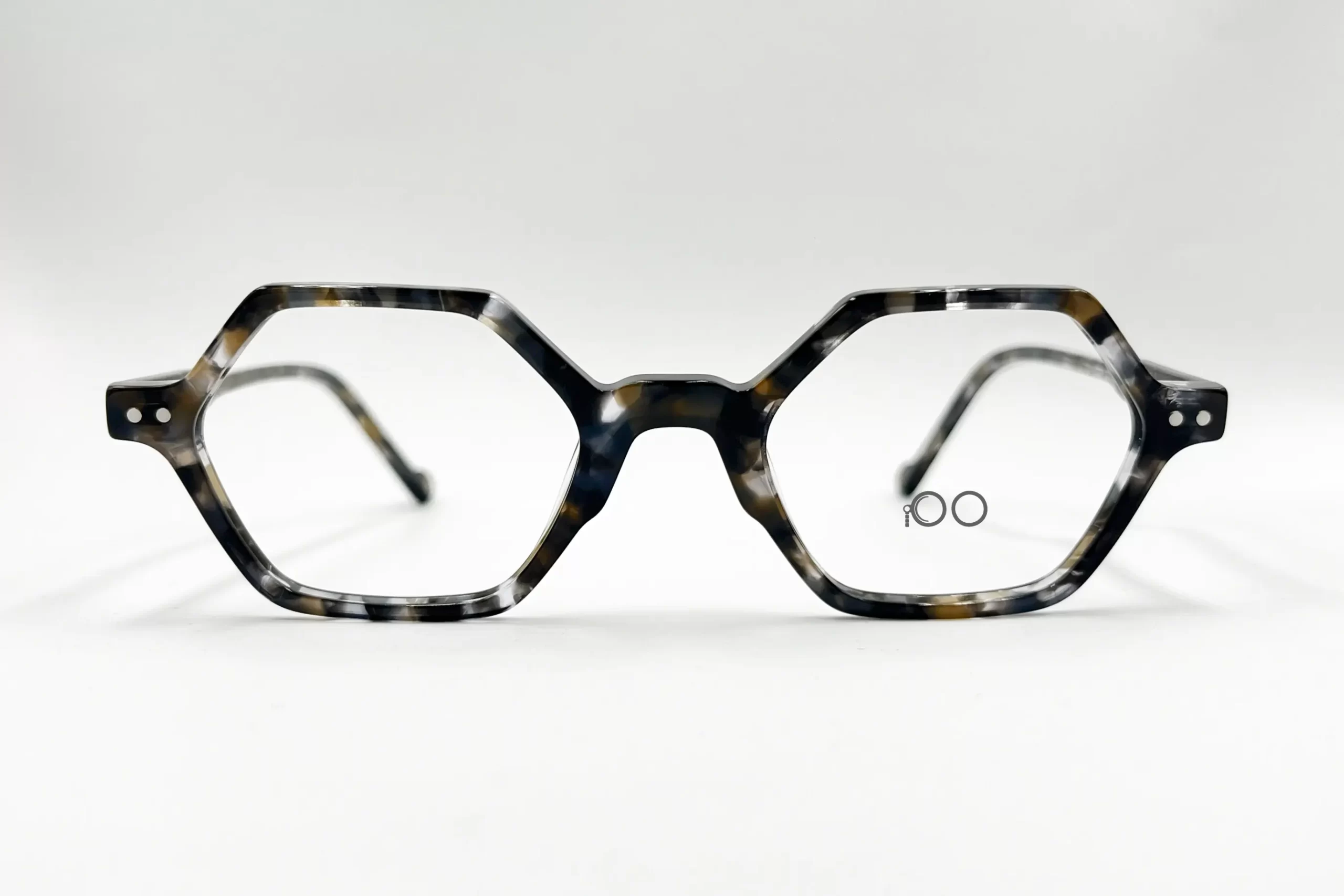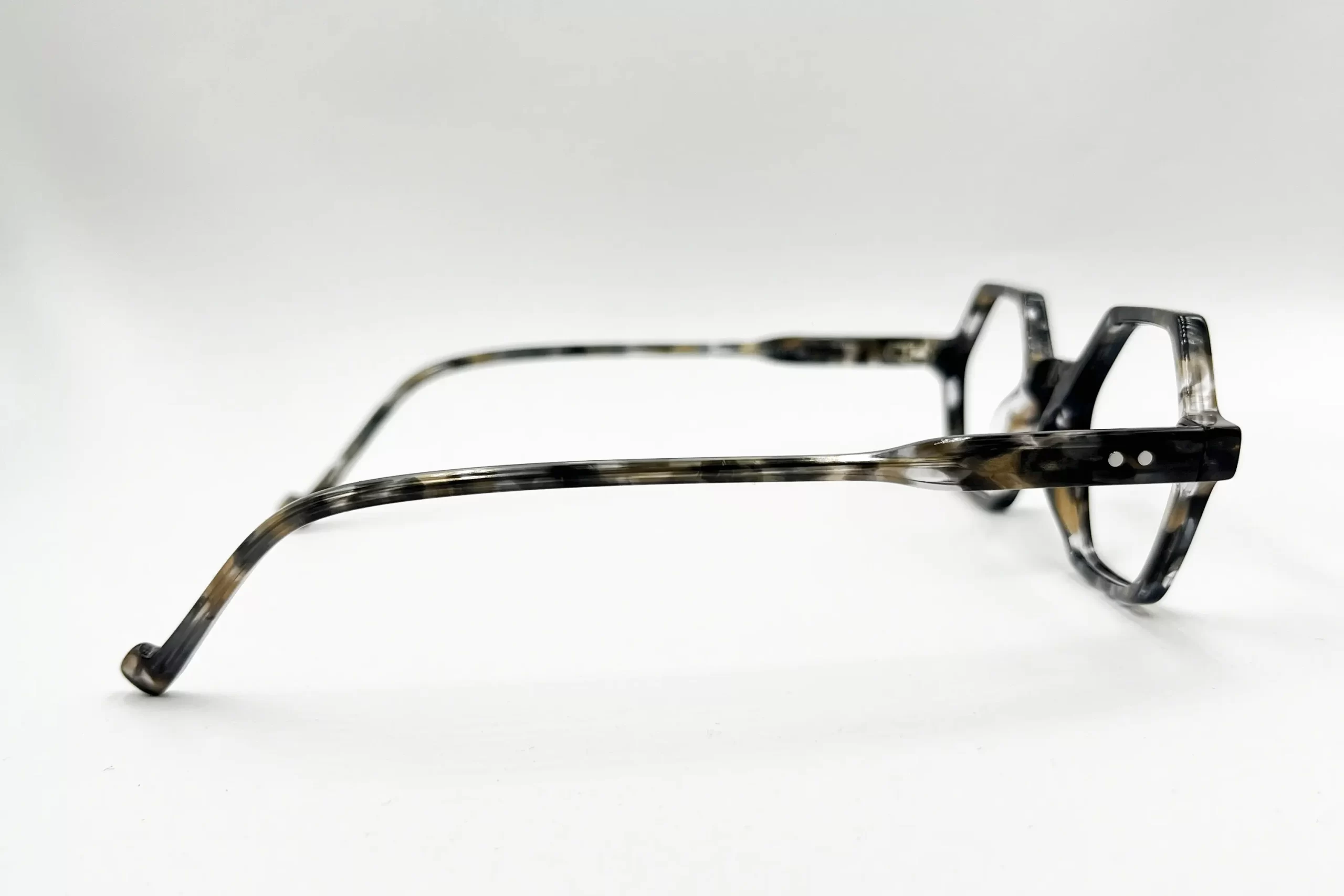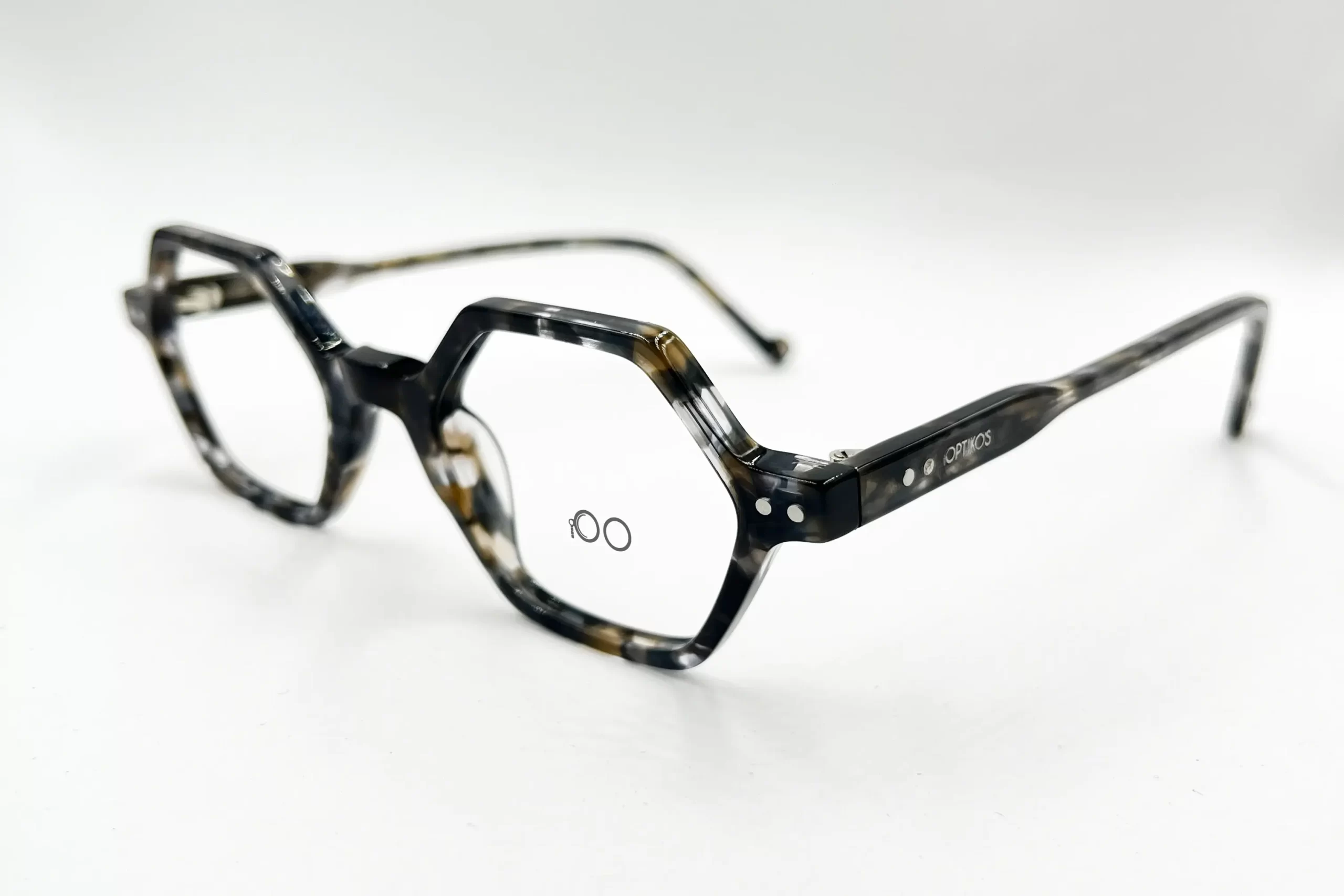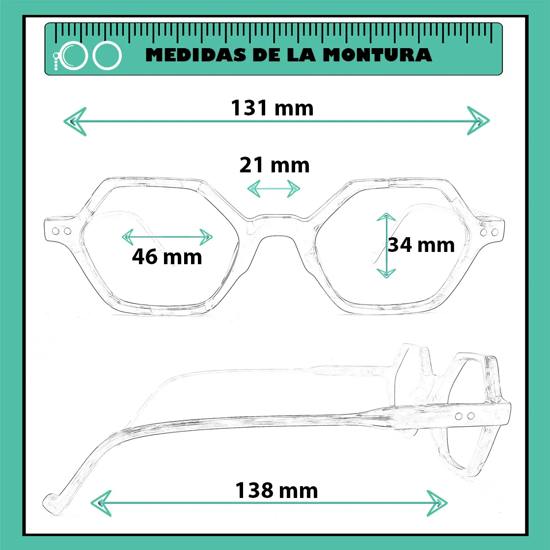 Montura estilo cuadrada geométrica, fabricada en material acetato, color gris-tortoise, con un marco completo talla S, con un peso aproximado de 26 g, incluye cofre para guardarlas.