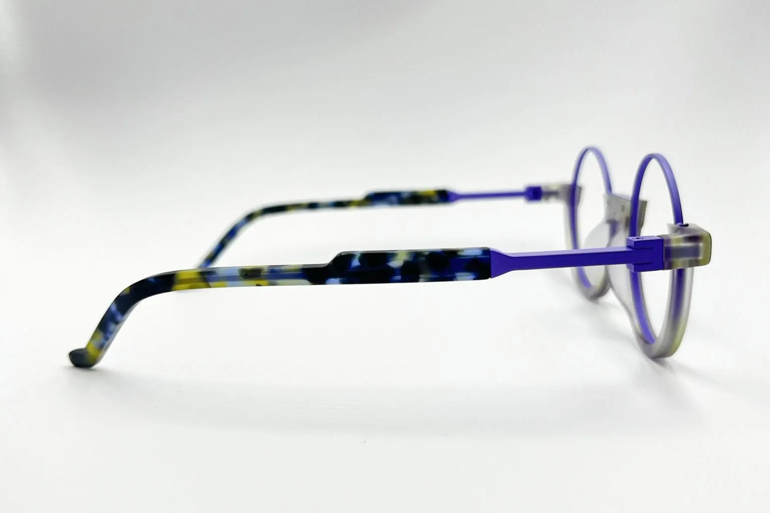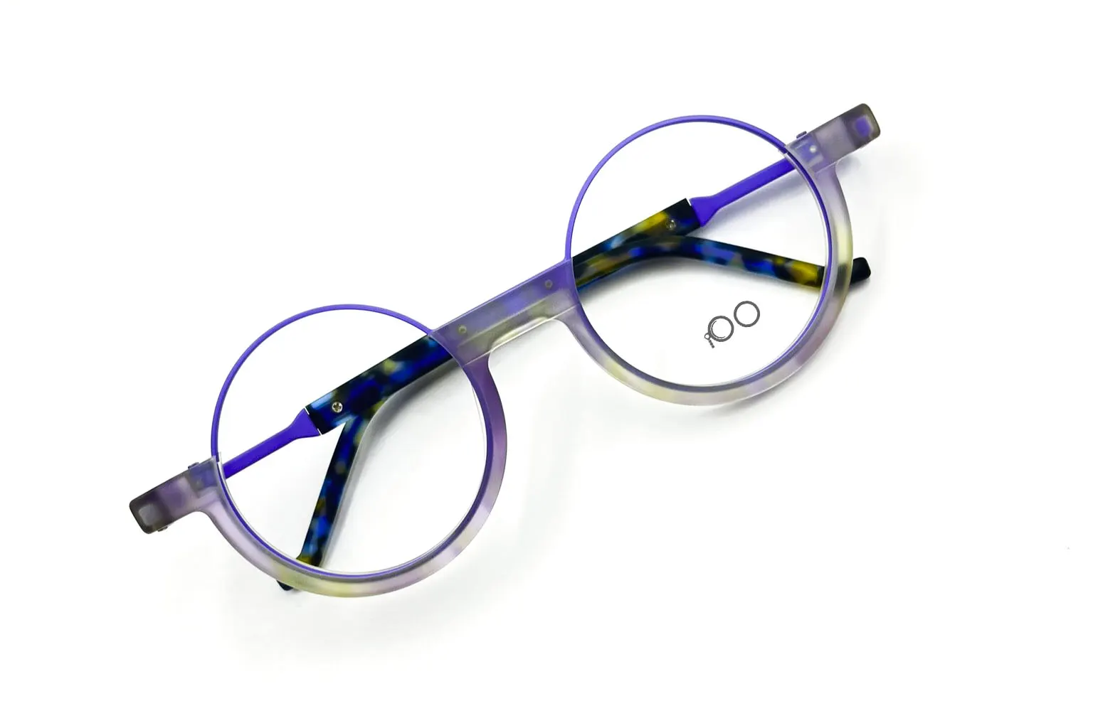 Montura estilo redonda, fabricada en material acetato- metalica, colores morado, con un marco completo talla s, con un peso aproximado de 22 g incluye cofre para guardarlas.