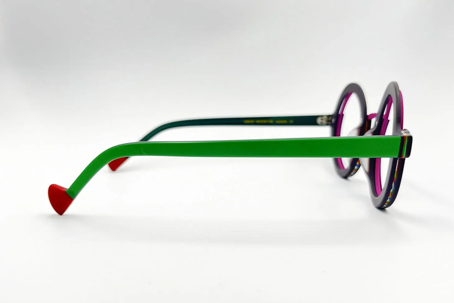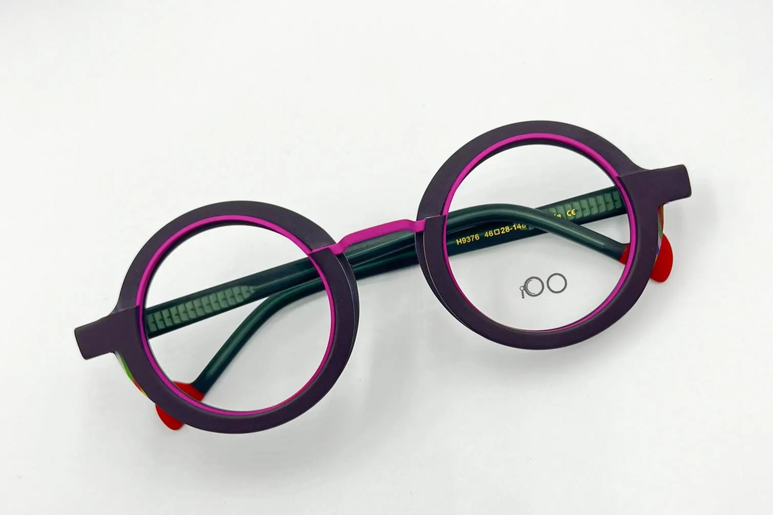 Montura estilo redonda, fabricada en material acetato- metalica, colores morado, con un marco completo talla s, con un peso aproximado de 22 g incluye cofre para guardarlas.