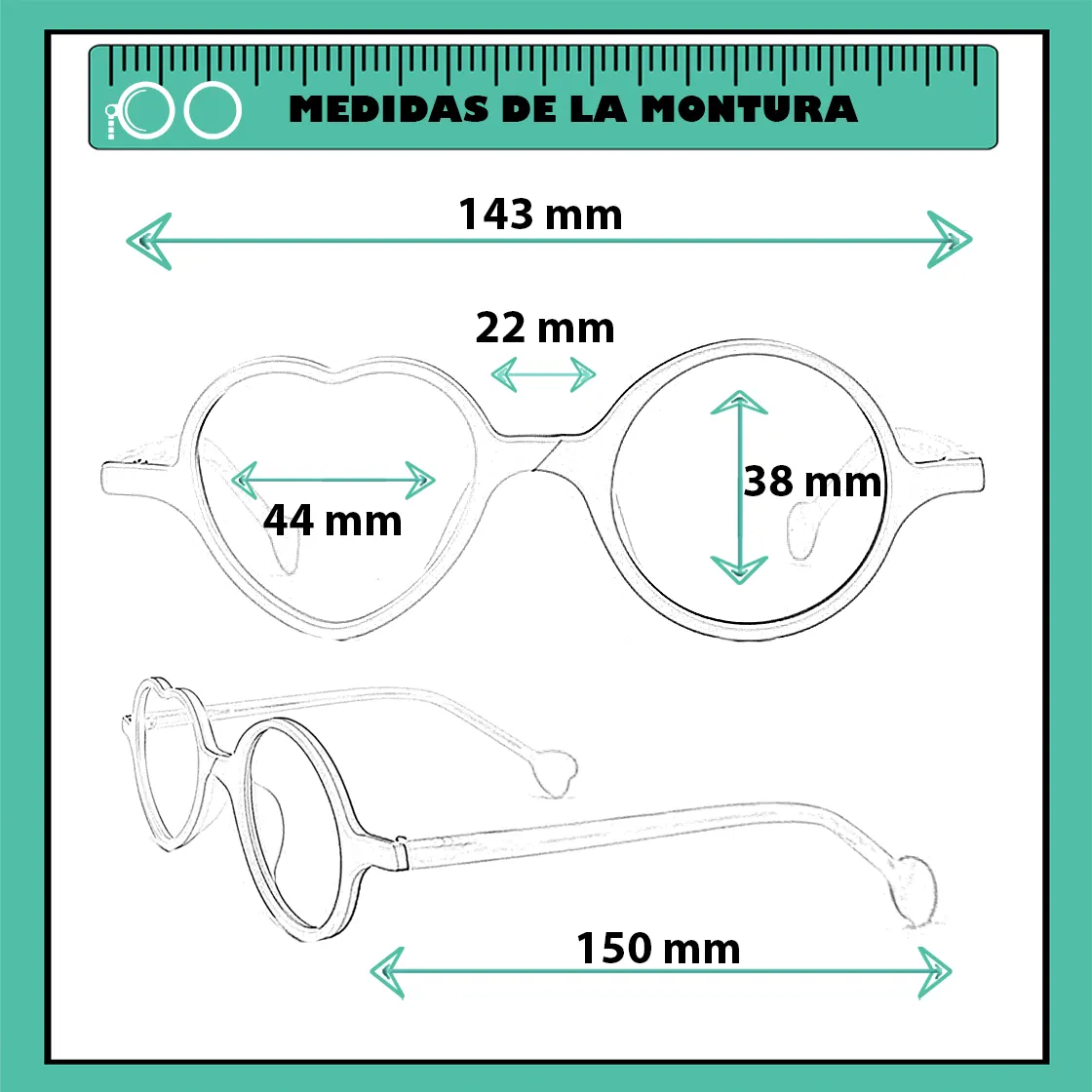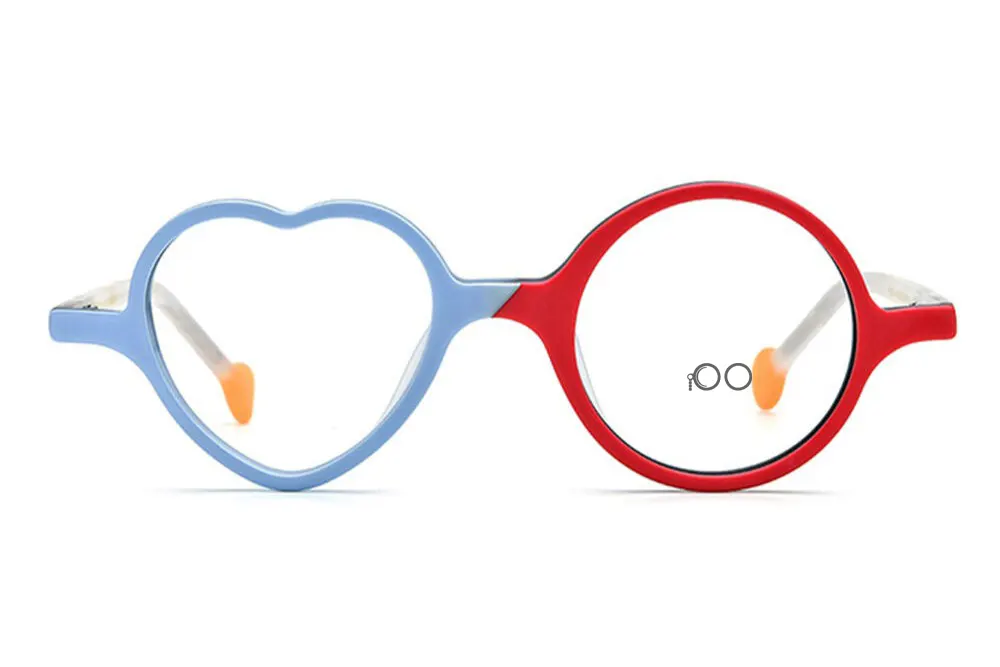 Montura estilo redonda-corazón, fabricada en material acetato, color azul-rojo, con un marco completo talla S, con un peso aproximado de 26 g, incluye cofre para guardarlas.
